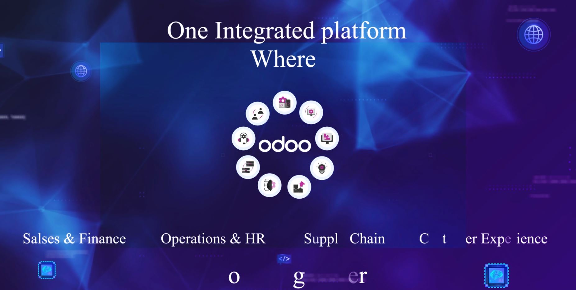 We developed a kinetic "Keynote Opener" that serves as the visual manifesto for the "Saudi Smart Era." Utilizing After Effects for advanced UI animation and kinetic typography, we visualized the Odoo ecosystem as a living digital brain. We blended cinematic footage of Riyadh’s business district with stylized data visualizations, creating a seamless flow from the national vision down to the specific software modules (HR, Finance, Operations).